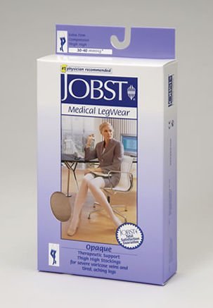 Jobst Opaque Closed Toe thigh high compression stockings in the 30-40 mmHg extra firm compression feature a beaded silicone top band and Advanced Comfort Technology. Choose from a 2 popular colors including: Classic Black and Silky Beige. Sold per pair.. . Fabric Content: 68% Nylon, 22% Spandex 10% Silicone - LATEX FREE. . Luxuriously smooth and easy to wear Jobst Opaque is ultra soft for the most comfortable stocking in its class. Lightweight and highly effective in optimizing leg health. Special processing and a silicone blend softener make these stockings easier to put on.... . **Beaded Silicone on top band keeps stockings in place. **Resilient yarns allow for greater durability . **Reciprocated heel and toe for better fit and durability. **Smooth design and soft texture provides softer more fashionable look with the ultimate in year-round coverage. . Color may not be as shown